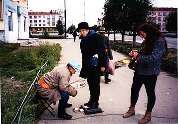 9月12日 正午過ぎ、同行する斎藤先生と合流。モンゴル航空904便は定刻午後3時に関西空港を離陸した。出発直前になって現地では英語は通じにくいらしいので、ロシア語を勉強して下さいと言われたが、どうせゼロから始めるのならば、やっと旧ソ連崩壊によって民主化しつつある国なのだから、やはり母国語であるモンゴル語をやった方がいいでしょうという事になり、今更とは思いながらモンゴル語の本を買いに行ったのだった。テープは在庫が無かったので、インターネットで取り寄せてもらい、スーツケースに荷物を詰めながら基本会話を覚えた。 機内アナウンス、乗客の会話、初めて聞く生のモンゴル語だ。私の隣の席のおじさんは、モンゴル焼酎アルヒを飲みながら、しきりに話しかけてくる。昨夜は資料の整理に追われ、ほとんど徹夜だったので、飛行機で寝ようと思っていたのだが、せっかくの機会なので、おじさんに挨拶の発音をチェックしてもらった。そうこうしているうちに、午後7時20分無事ウランバートルに到着。JICAの城水氏が出迎えに来てくれていた。車で少し走ると、牛や羊が道路を横切る牧歌的風景が現れ、町の印象は人通りが少なく閑散としている。考えてみれば、モンゴルは日本の4倍の国土に、人口はわずか230万人。それに比べて家畜数は3100万頭以上だということを思い出した。大使館の資料を読んだだけではピンとこなかったが、実際の光景を目にすると、実感できるものである。約20分でホテルに到着。通訳のチョロンさんと城水氏と明日からのスケジュールを打ち合わせる。