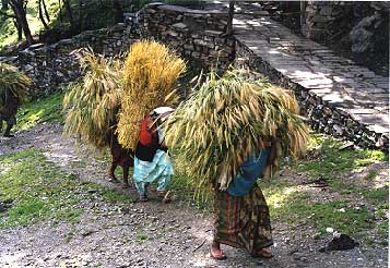 12月に満開になるというサクラ並木の道を抜け、仏塔のある尾根の上に出ると沢山の民家がある。周辺の畑は土地も肥えジャガイモやトウモロコシ等幾種類もの作物も生育が良い。