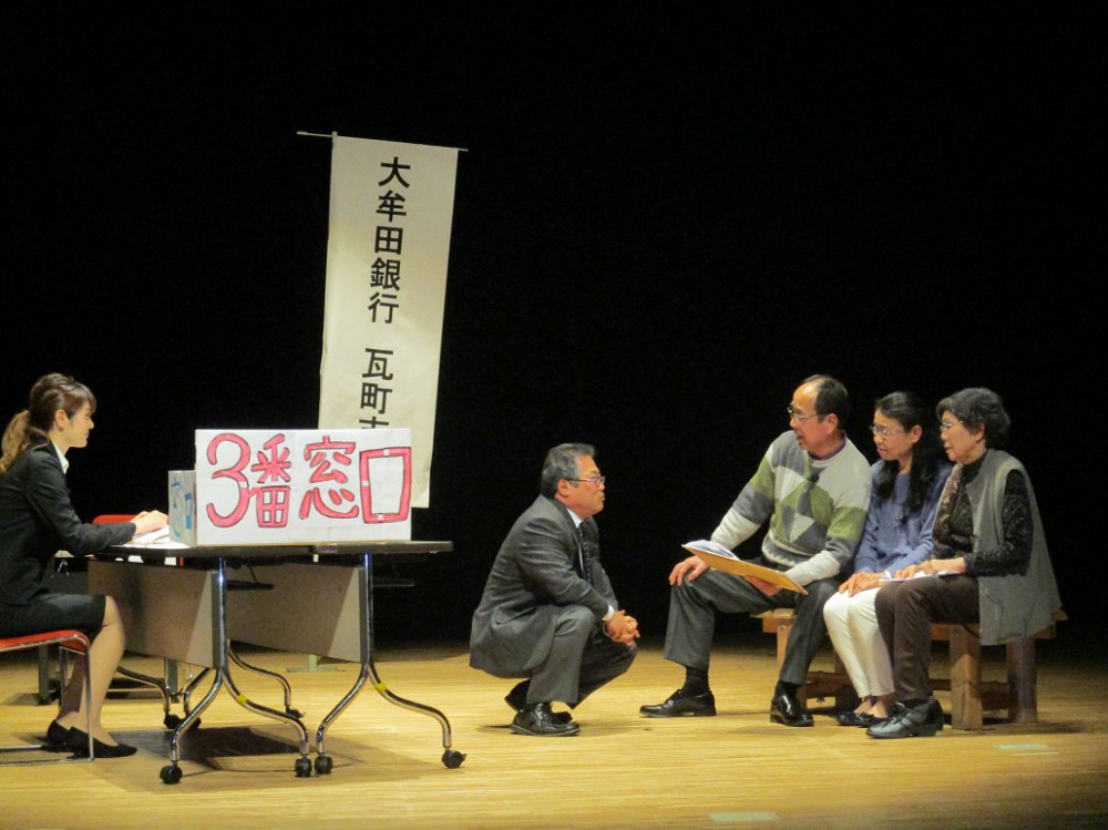 講師の小谷みどり氏 寸劇の一場面(銀行にて)
